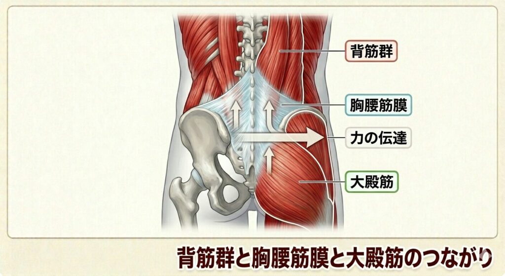 背筋群は胸腰筋膜と連結し、胸腰筋膜は大殿筋上部繊維と繋がります