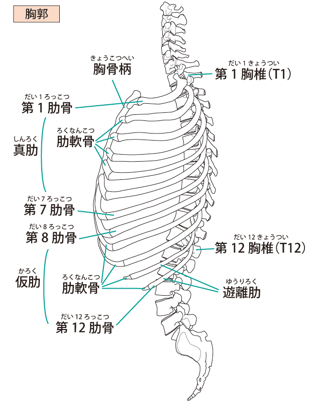 肋骨: 胸郭の大部分を形成し、胸椎と胸骨をつなぐ。