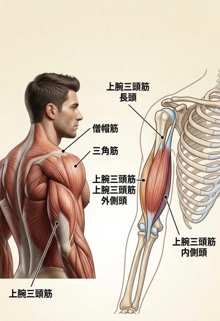 上腕三頭筋は、3つの筋腹を持つ筋肉です